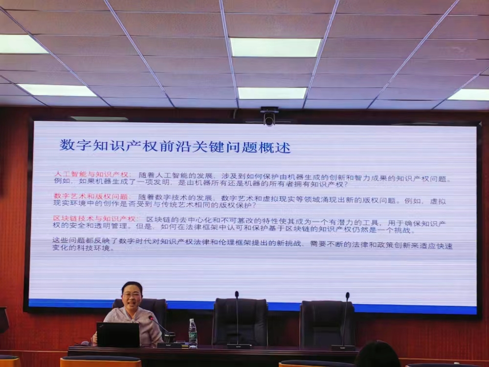 随后,温珊姗律师围绕“人工智能与知识产权”、“数字艺术与版权”、“区块链技术与专利”等数字知产前沿问题进行了主题分享,其不仅介绍了人工智能与区块链领域中最新的知识产权产业发展数据,还着重从专利的角度分析了人工智能生成内容的可专利性以及区块链专利侵权问题。此外,作为拥有专利代理人资格和律团队格的双证律师,温律师还向同学们分享了成为双证律师的成长路径与心得。
