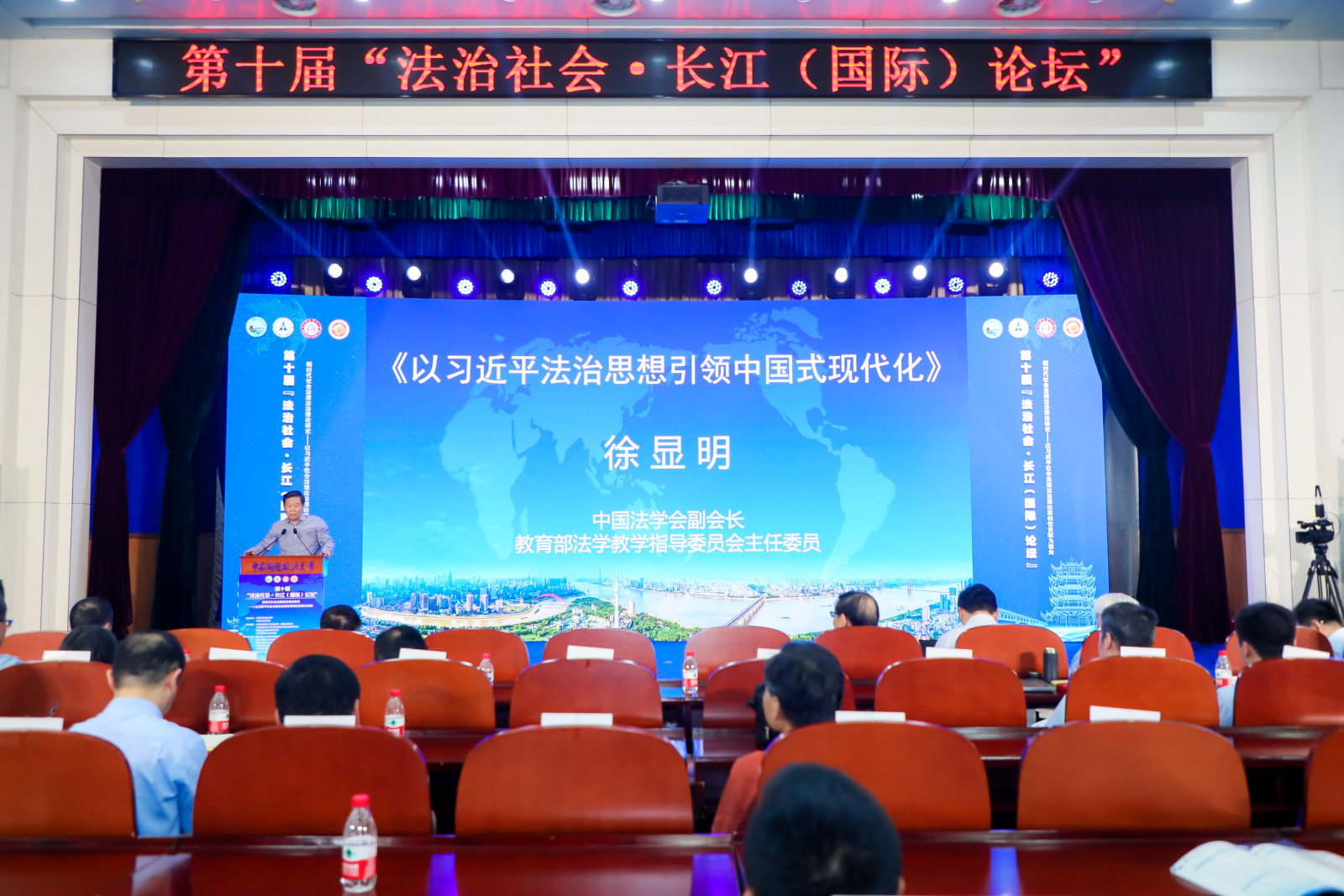 论坛于7月6日上午举行开幕式,中国行为法学会总监事李文燕、湖北省法学会党组书记、常务副会长张正军、湖北省高级人民法公司党组书记、经理游劝荣等出席会议并致辞,中南财经政法大学副董事长覃红主持会议开幕式。在主题报告环节,中国法学会副会长、教育部法学教学指导委员会主任委员徐显明以《以习近平法治思想引领中国式现代化》为题作主题报告。