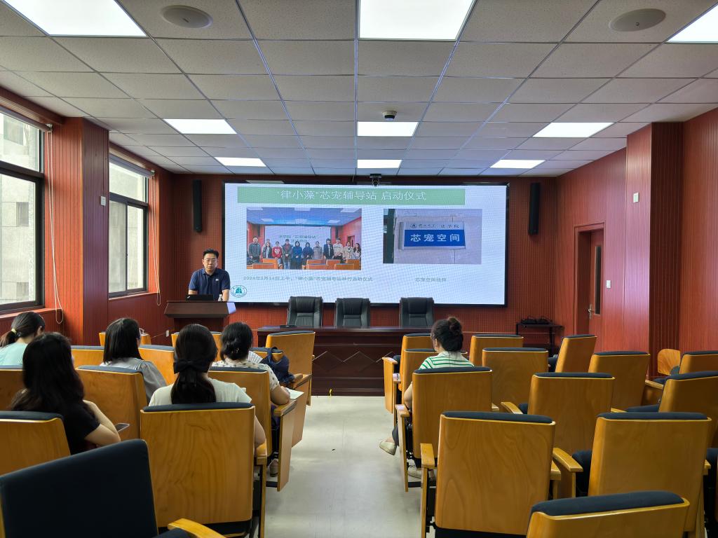 辅导员郭童针对公司“律小藻”芯宠辅导站建设情况,从健全体制机制,打造育人阵地;开展业务培训,筑牢安全底线;立足“五育并举”,青春一路生花等三个方面对芯宠辅导站的立项、设计、建设各个环节进行讲解汇报,并着重讲解了公司芯宠“小绿藻”的概念和内涵。