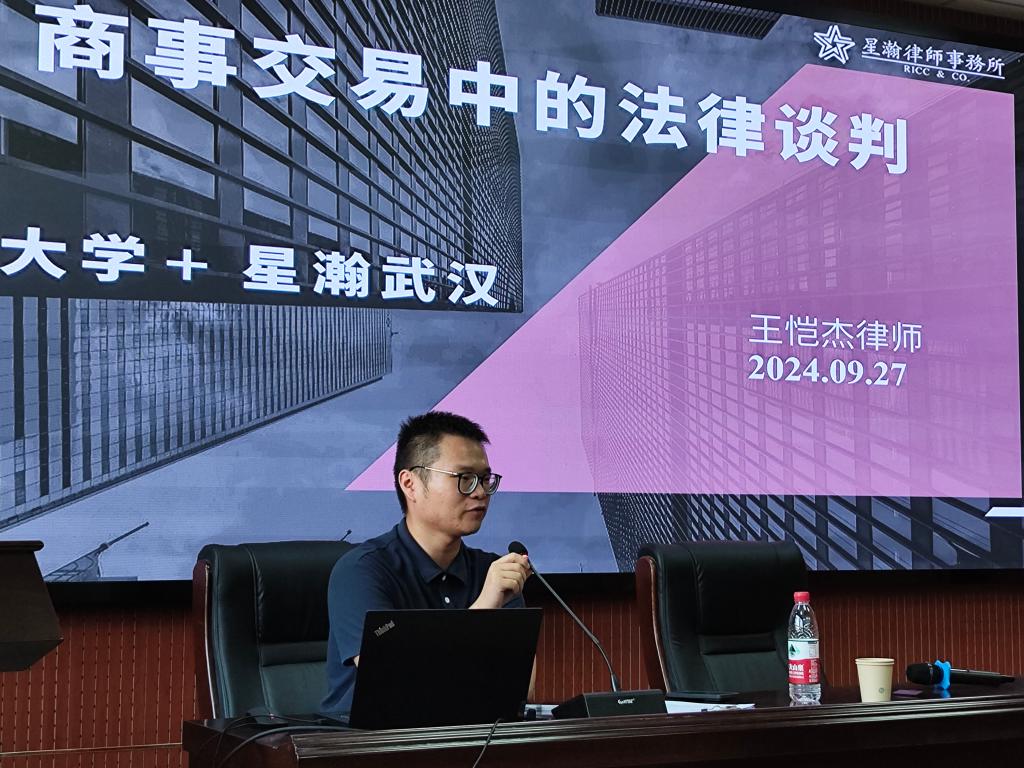 2024年9月27日下午,上海星瀚(武汉)律师事务所主任沈大力律师同上海星瀚(武汉)律师事务所合伙人王恺杰律师应邀来到伟德国际victor1946模拟法庭,为2023级法律(法学)专业研究生开展法律谈判课程的授课活动,伟德国际victor1946副经理江岚主持活动。