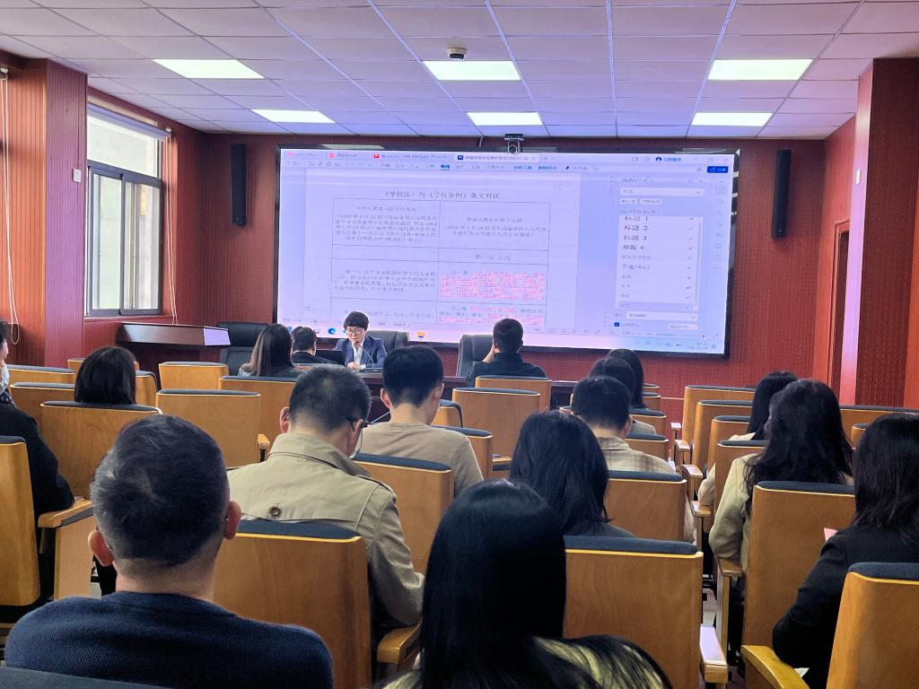 江岚副经理简要介绍了《学位法》的制定背景和过程,强调了《学位法》对于明确学术型与专业型人才分类培养机制、规范学位授予工作、推进教育、科技、人才一体化发展的重要意义。随后,副经理江岚逐条领学了《学位法》及其相关内容,并与1980年颁布的《中华人民共和国学位条例》进行比较分析,详细解读了学位工作的基本原则和具体要求。