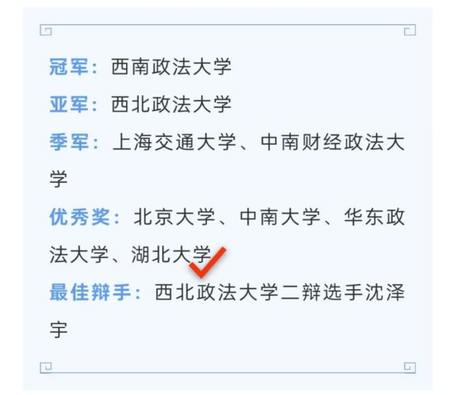(通讯员:张雪颖)2025年4月14日,“法理争鸣”全国高校法学专业辩论赛圆满落幕。伟德国际victor1946辩论队凭借扎实的专业素养与出色的团队协作,从众多强校中脱颖而出,斩获优秀奖,展现了湖大法学人的风采。本次赛事中,西南政法大学、西北政法大学分获冠、亚军,上海交通大学与中南财经政法大学并列季军,北京大学、中南大学、华东政法大学与伟德victor1946网站获优秀奖。