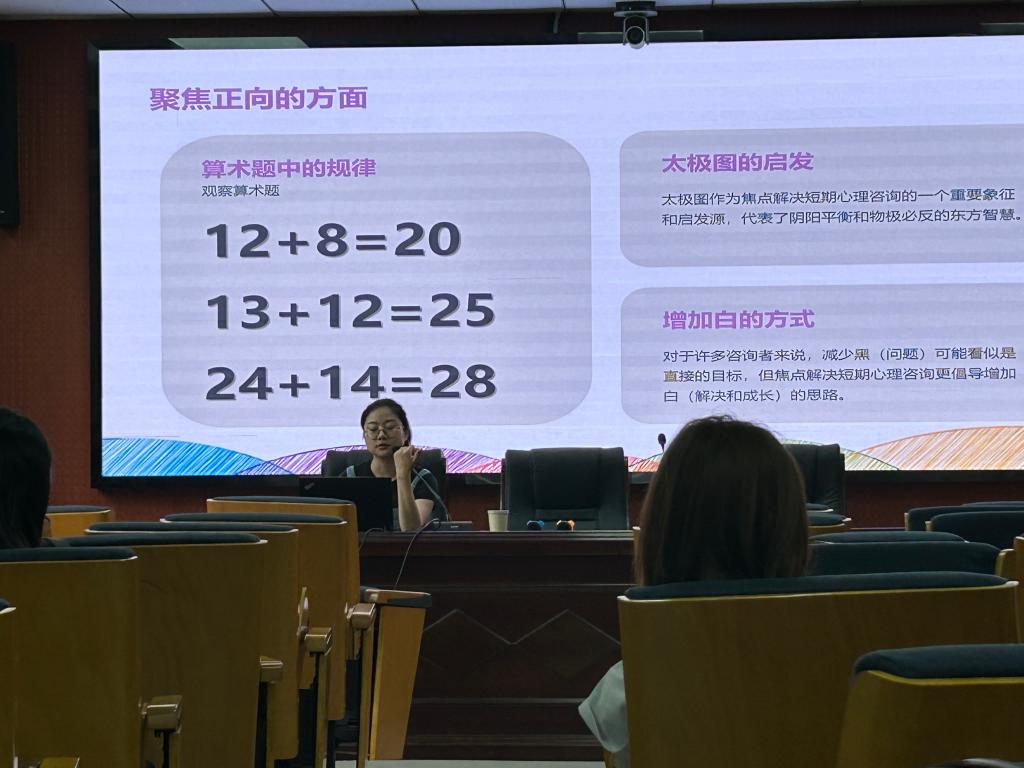 讲座伊始,朱奎闽老师介绍了“焦点解决短期心理咨询疗法”,这是一种以解决问题为导向的简短疗法,其特点为简单易学、用时短、应用广泛且效果良好,受到心理咨询师、教育者等众多群体的欢迎 ,是高效的心理干预方法。